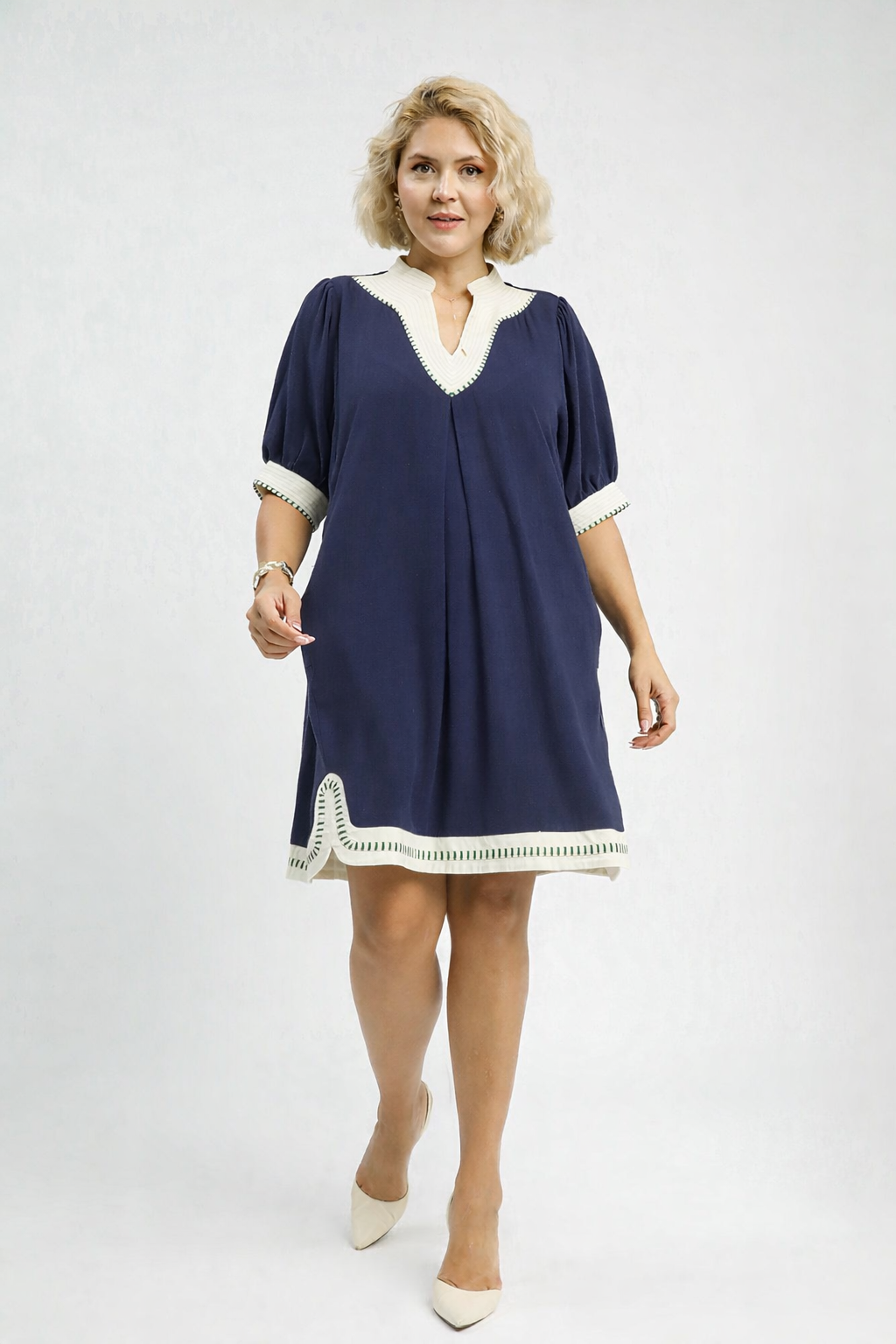 • Deep V-notch neckline with structured contrast trim